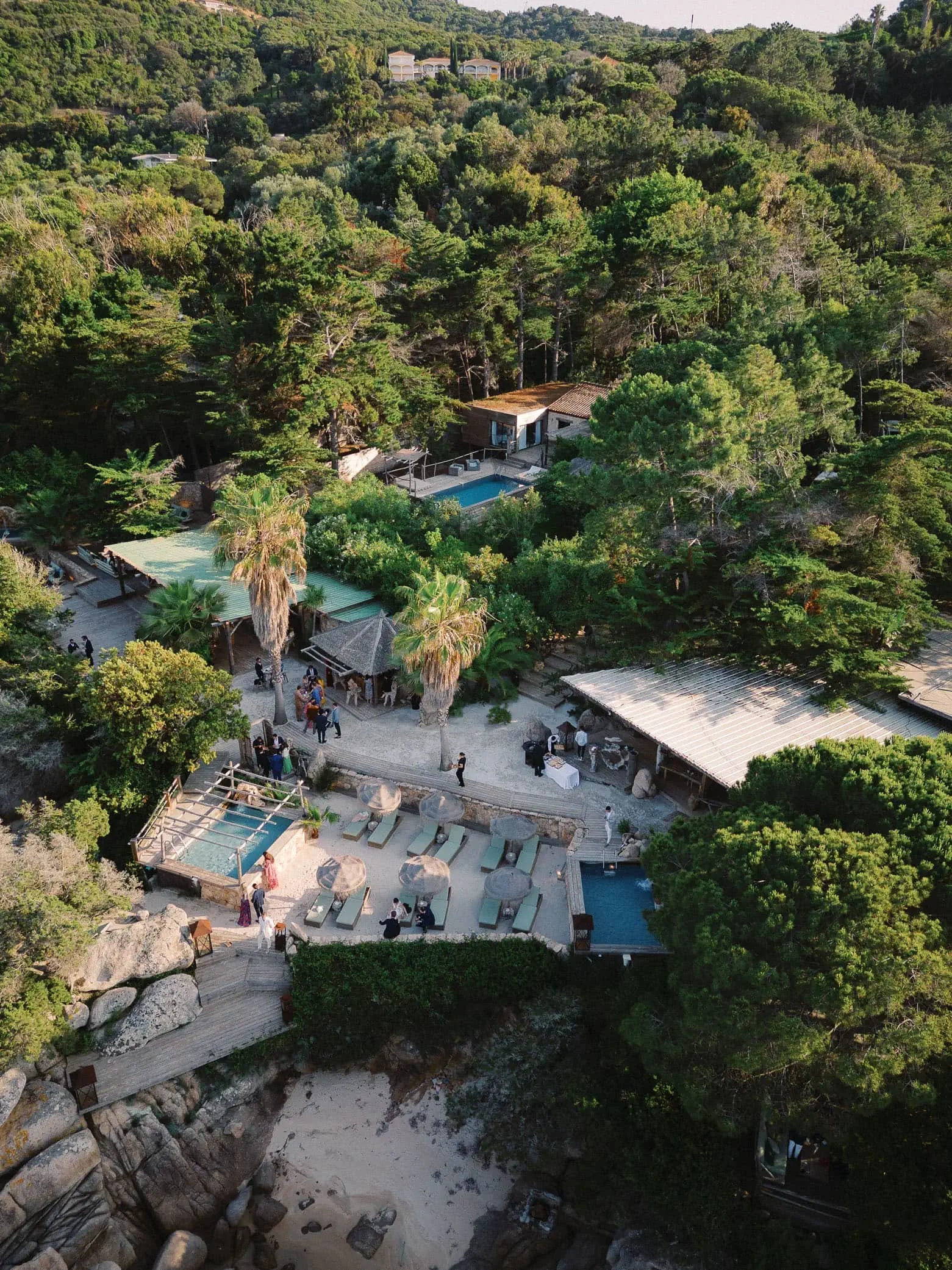 Le clou de ce week-end nuptial fut sans aucun doute le brunch au Domaine de Saparella. Un lieu où la paillote offre une vue époustouflante sur le golfe d’Ajaccio et les Iles Sanguinaires. C’est dans ce cadre somptueux que s’est célébré le dernier jour du mariage de Julia et Maxence.